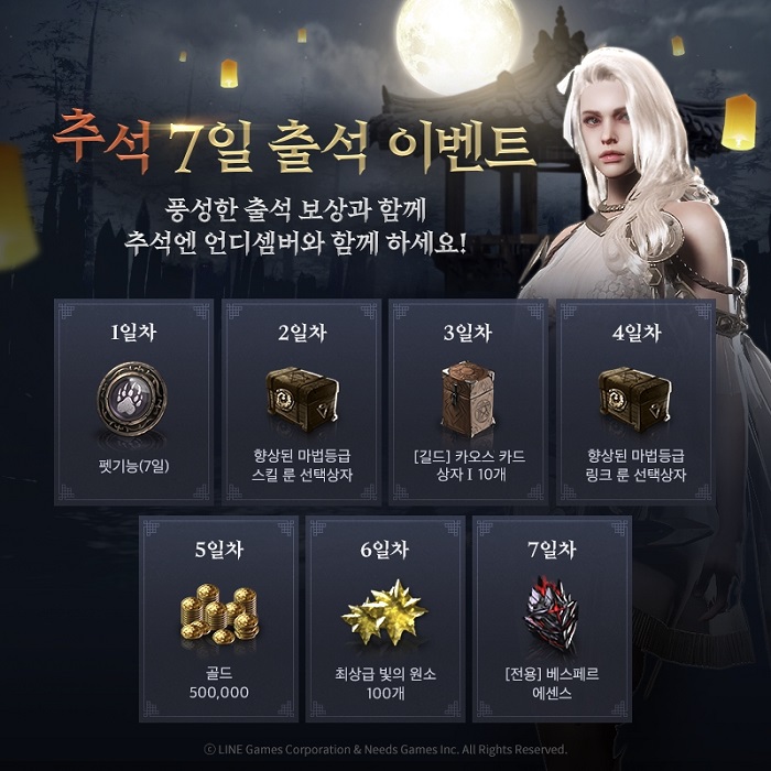 한편 ‘언디셈버’는 추석을 맞아 9월 15일까지 다양한 이벤트를 진행한다. 먼저 이 기간 중 접속일에 따라 ‘베스페르 에센스’와 ‘합성 전용 룬’ 등을 제공하는 출석 이벤트가 실시된다. 또한 ‘윷놀이 방식’의 이벤트에 참여하면 ‘전설 상승 에센스 조각’ 및 ‘부적 전설 상승 에센스’ 등 높은 가치의 아이템을 다양하게 획득할 수 있다.