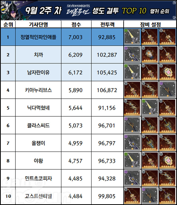 넷마블 '세븐나이츠 레볼루션' 9월 2주차, 생도 결투 부문에서는 '정열적인파인애플' 유저가 2주 연속 랭킹 1위를 기록하는 한편, 영웅 결투 부문에는 새로운 최강자가 등장했다.