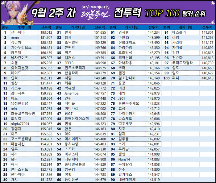 전투력 랭킹 TOP 100 기준 평균 전투력은 149,061로, 지난주와 비교했을 때 약 10,000 가량 상승한 수치다. 전나쎄다 유저는 매우 빠른 성장세를 보여주고 있음에 따라 9월 3주차에는 무난히 20만 전투력 돌파가 가능할 것으로 예상된다.