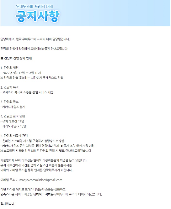 카카오게임즈는 13일 자사가 서비스 중인 우마무스메 프리티 더비 공식 카페를 통해 유저 간담회 일정을 공지했다.