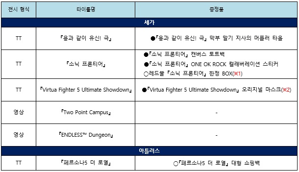 [자료제공 = 세가퍼블리싱코리아] 세가퍼블리싱코리아(대표 사이토 고)는 2022년 9월 15일(목)부터 9월 18일(일)까지 마쿠하리 멧세에서 개최되는 「도쿄게임쇼 2022」(이하, 「TGS2022」)의 세가/아틀러스 부스 전시 타이틀 상세 정보와 증정품 라인업, 방송 일정을 공개했다.