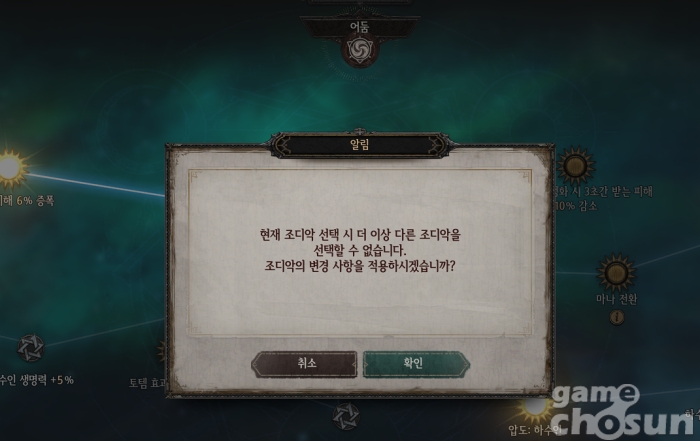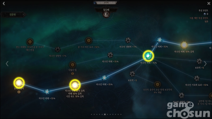 대신 하나의 계열을 선택하면 다른 전문화 특성은 투자할 수 없으며 6단계 이후 개방되는 전문화 2단계도 1단계에서 투자했던 계열만 선택할 수 있다. 즉, 자신의 빌드 방향성을 확실하게 정하는 조디악 특성이라 할 수 있다.