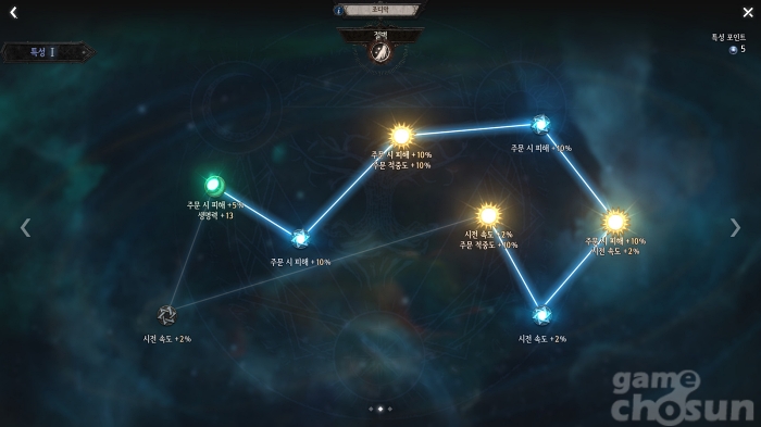 6단계는 무려 25포인트를 하나의 계열에 투자하게 된다. 이런 어마어마한 수치의 포인트를 투자할 계열은 주문 빌드를 위한 '숨결'로 속성 별로 나뉘어 있는 것도 모자라 시전 속도, 주문 치명도까지 시작 노드를 공유한다.