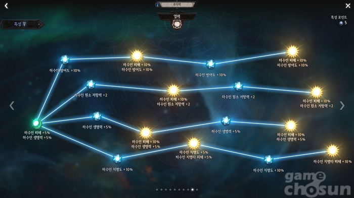 5단계도 4단계와 마찬가지로 소환 계열 특성인 열매 또는 광산 중 하나를 투자해 주자. 공격력 관련 능력치와 생존 관련 능력치가 합쳐져 있어 같은 단계의 다른 조디악에 비해 두 배 가까이 되는 주요 노드가 배치되어 있다.