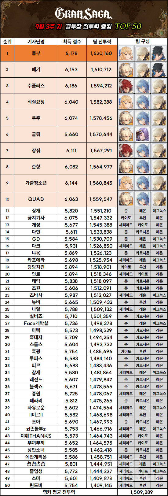 랭커들의 평균 전투력은 10,429 상승한 1,509,289다. 다만, 다음 업데이트로 추가되는 '해송'이 강력한 스킬 구성을 가지고 있고, 결투장 상위권에도 모습을 드러낼 것이 확실시 되고 있는 만큼, 다음 랭킹의 평균 전투력은 다소 하락할 것으로 보인다.
