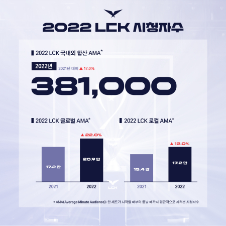 LCK는 2022년 한 해 시청 지표를 합친 수치를 공개했다. 프랜차이즈를 처음 도입한 2021년 시청 지표에서 크게 성장했던 LCK는 2022년 분당 평균 시청자수(Average Minute Audience; AMA)에서 전년의 32.6만보다 17% 상승한 약 38.1만 명을 기록했다. 이는 LCK 경기 한 세트가 시작할 때부터 끝날 때까지 평균적으로 지켜본 시청자수를 의미한다.