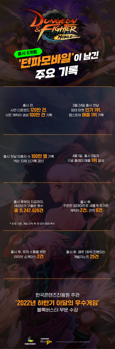 [자료제공 = 넥슨] 지난 3월 24일 국내 출시 후 모바일 액션 RPG 장르에 새로운 가능성을 제시한 ‘던전앤파이터 모바일(이하 던파모바일)’이 서비스 반년을 넘기며 순항하고 있다. 출시 후 꾸준한 업데이트와 유저 친화적 서비스 운영으로 ‘2022 하반기 이달의 우수게임’의 블록버스터 부문 수상을 하며 의미를 더했다.