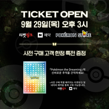 본 전시회의 티켓 예매는 29일 15시부터 티켓링크, 네이버 예약 및 포켓몬 스토어 온라인에서 오픈된다. 특히, 티켓링크와 네이버 예약에서는 티켓과 함께 특전 아이템인 투명 포스터를 함께 증정하는 사전 구매 특별 패키지도 한정 수량으로 판매될 예정이다. 그 외 자세한 티켓 권종, 할인 정보 등은 각 예매처에서 확인할 수 있다.