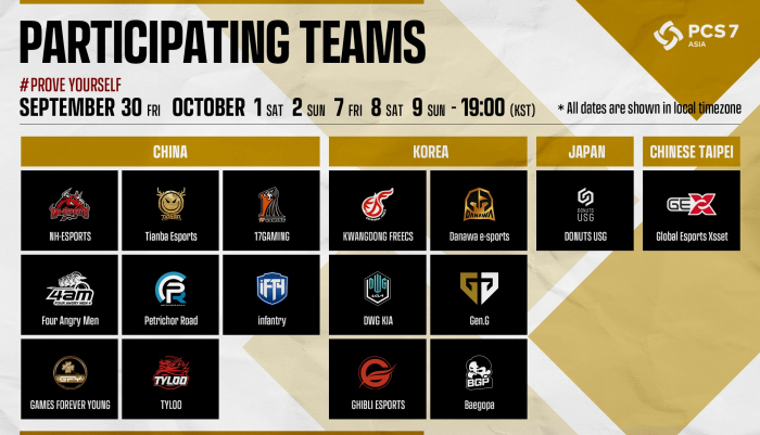 PCS7 아시아는 9월 30일부터 10월 9일까지 2주 동안 매주 금, 토, 일요일에 진행된다. 한국에서는 ‘펍지 위클리 시리즈(PWS): 페이즈 2’의 상위 6개 팀이 출전한다. 2022 PWS에서 2회 연속 챔피언에 오른 KWANGDONG FREECS(광동 프릭스)를 비롯해 Danawa e-sports(다나와 이스포츠), DWG KIA(담원 기아), Gen.G(젠지), GHIBLI ESPORTS(기블리 이스포츠), BGP(배고파) 등 6개 팀이 중국의 ‘펍지 챔피언스 리그(PCL)’ 서머 상위 8개 팀과 일본 지역 참가 팀 중 상위 1개 팀, 차이니즈 타이페이/홍콩/마카오 지역의 상위 1개 팀과 맞붙는다.