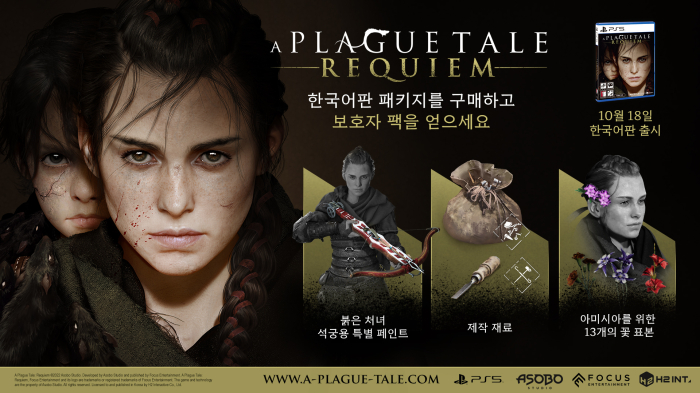 [자료제공 = 에이치투 인터렉티브] 에이치투 인터렉티브(이하 H2 INTERACTIVE, 대표 허준하)는 아소보 스튜디오(Asobo Studio)의 ‘플래그 테일: 레퀴엠 (A Plague Tale: Requiem)’ PC 및 PS5 한국어판을 오는 10월 18일 정식 출시할 예정이며 9월 30일부터 PS5 한국어판 패키지의 예약 판매를 진행한다고 밝혔다.