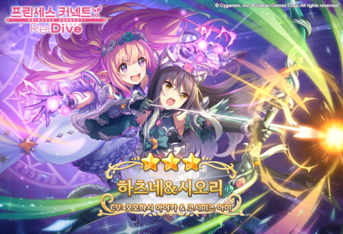 이번에 새롭게 등장하는 ‘하츠네&시오리’는 후열에서 유대감의 힘을 발휘하는 사이좋은 자매이며, 적의 수가 늘어날수록 위력이 높아지는 공격 스킬과 주변 아군들을 강화하는 스킬을 구사한다. 유니온 버스트(필살기)인 ‘마이 디어 스타’는 자신의 물리 공격력을 대폭 증가시키고 전방에 위치한 적 전체에 물리 대미지를 입힌다.