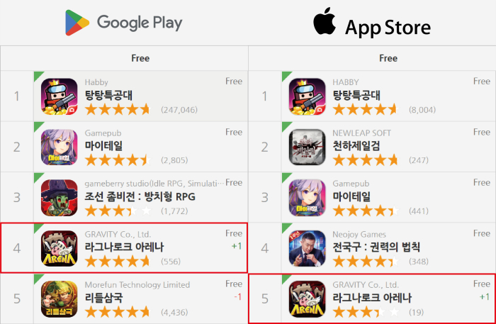 라그나로크 아레나는 장르의 조화와 탄탄한 게임성으로 론칭 이후 계속해서 상승 곡선을 그리는 중이다. 구글 플레이 스토어 평점 4.5점, 애플 앱 스토어 평점 4.6점을 기록하고 있으며 구글 플레이 스토어 무료 인기 게임 순위 4위, 애플 앱스토어 무료 인기 게임 순위 5위에 오르는 등 호성적을 이어가고 있다. 특히 구글 플레이 스토어에서는 론칭 첫날 50위권에서 시작해 가파르게 순위가 올랐다는 점에서 더욱 주목할 만하다. 이에 멈추지 않고 그라비티는 10월 4일 라그나로크 아레나 첫 번째 업데이트로 상승세를 이어나갈 계획이다.