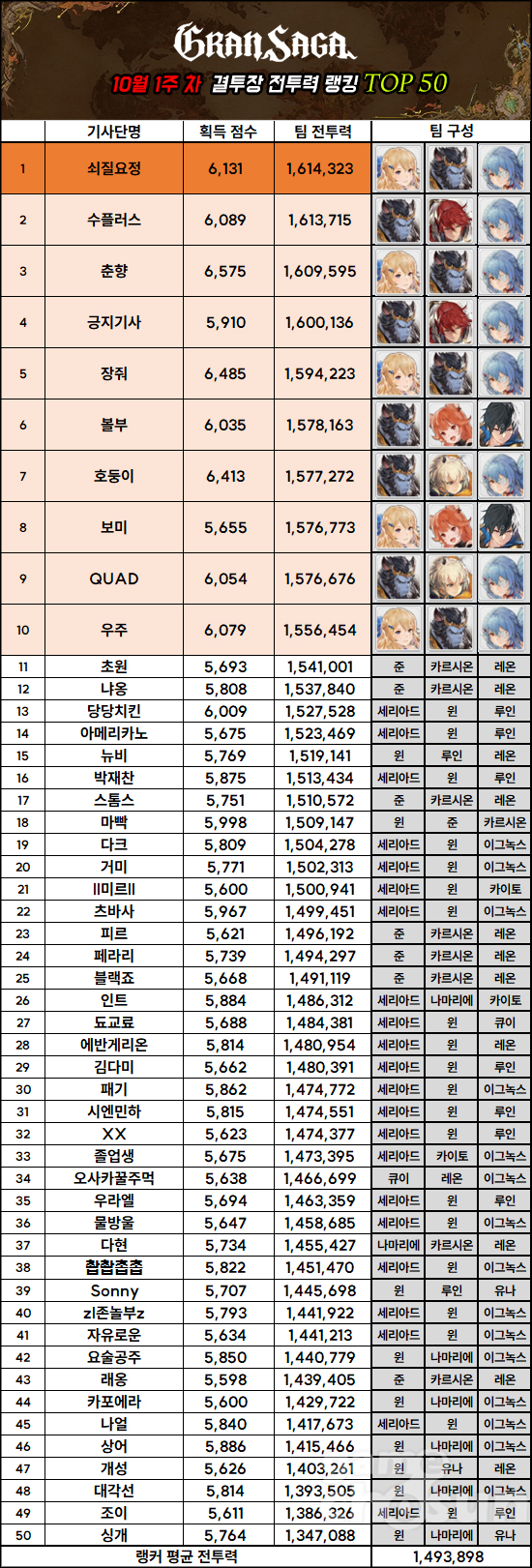 전투력 랭킹 1위는 오랜만에 '쇠질요정'이 차지했다. 전투력은 10,353 상승한 1,614,323이며 파티는 지난 랭킹과 동일한 '세리아드, 윈, 루인'이다. 전투력 1위 파티가 '준, 카르시온, 이그녹스'에서 '세리아드, 윈, 루인'으로 바뀌면서 전투력은 다소 하락했으나 쇠질요정을 비롯한 많은 랭커가 꾸준한 속도로 성장 중이다.