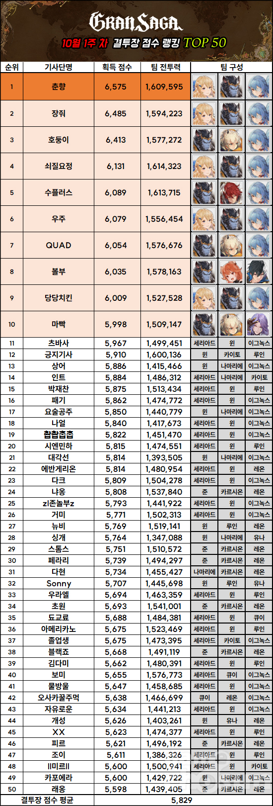 세리아드, 윈, 루인 파티를 사용하는 '춘향'이 지난 랭킹에 이어 이번 랭킹에서도 점수 1위를 차지했다. 획득 점수는 지난주 대비 300점 상승한 6,575점으로 2위 '장줘'와 90점 차이였다. 3위 '호둥이'까지 3인은 각각 6,400점이 넘는 점수를 획득하며 정상결전을 치렀지만, 그외 랭커들의 점수는 큰 변동이 없어 평균 점수는 12점 상승한 5,829점에 그쳤다.