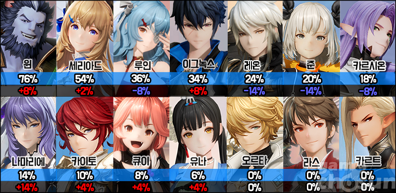 눈여겨볼 부분은 상위 10위권 내 랭커들의 캐릭터 선택률이다. 해송을 받은 윈은 10명 모두가 선택했고, 함께 세트로 사용되는 루인도 무려 8명이 채용 중이다. 이외에도 세리아드, 준, 큐이, 카이토, 카르시온, 이그녹스 등 그 어느 때보다 다양한 캐릭터들이 10위권에서 포착됐다.