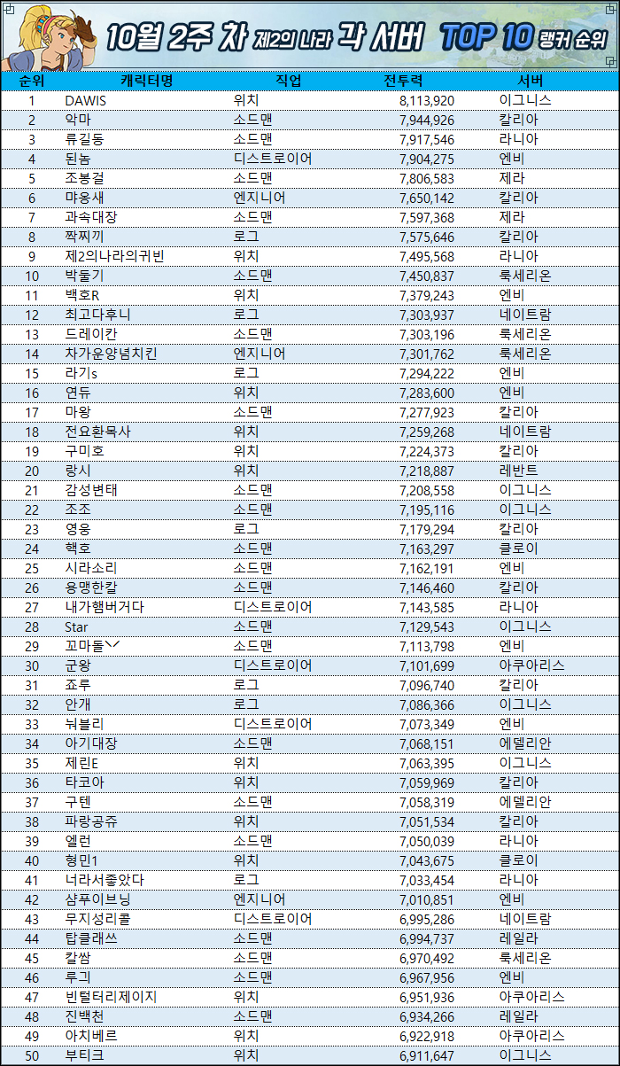 제2의 나라 10월 2주 차 전 서버 전투력 랭킹 1위는 이그니스 서버 위치 'DAWIS'가 차지했다.