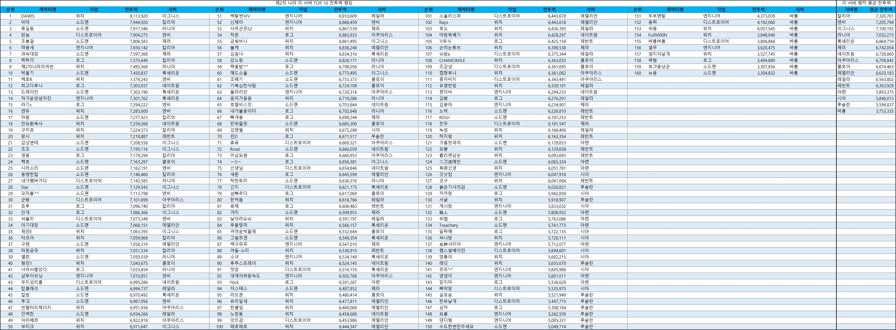 - 일부 랭커의 전투력이 지난주와 동일하게 노출되거나, 주력 직업이 아닌 다른 직업으로 표기되는 사례가 발생되고 있다. 이에 따라 랭커 순위에 오차가 발생할 수 있습니다.