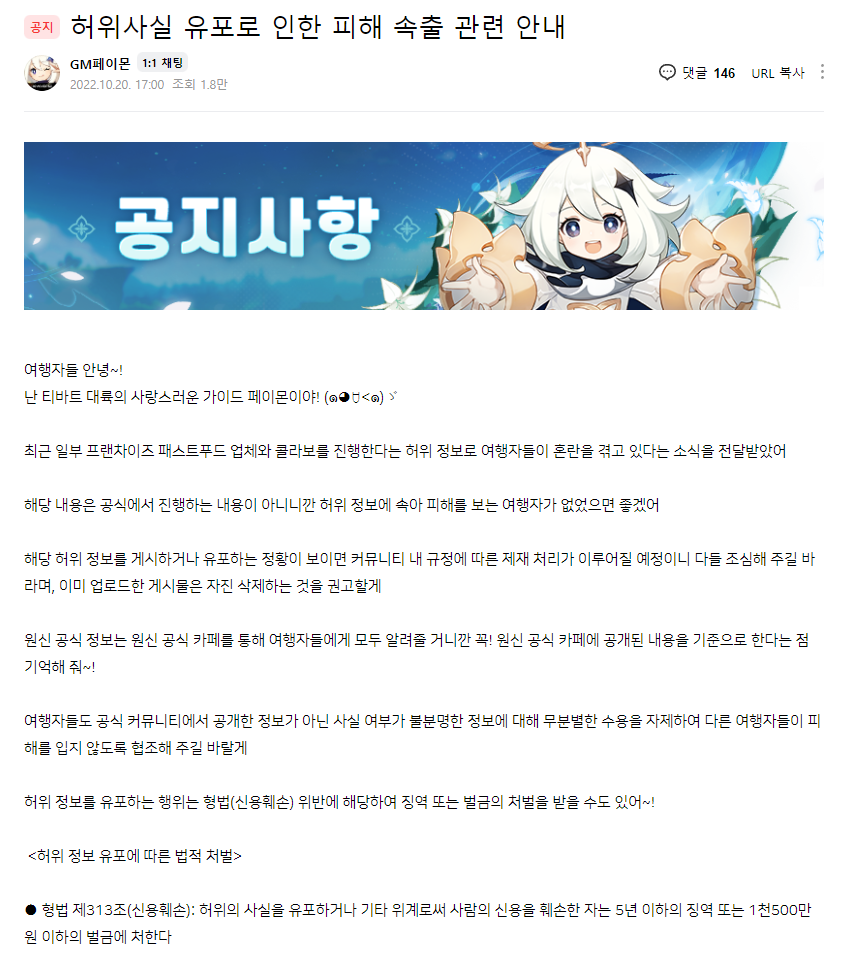 ▲ 원신 카페의 GM페이몬이 업로드한 공지사항