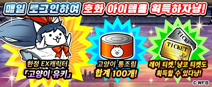 이벤트 기간 중 로그인하면 하루에 한 개씩 스탬프를 받을 수 있으며, 스탬프를 7개 모으면 콜라보 한정 EX캐릭터 ‘고양이 유키’를 받을 수 있다. 이 외에도 여러 아이템을 획득할 수 있다.
