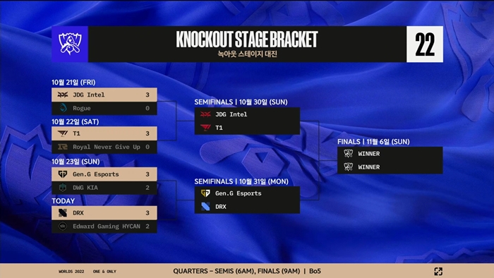 라이엇 게임즈에서 개발 빛 서비스하고 있는 인기 MOBA 게임 '리그 오브 레전드'의 2022 시즌 월드 챔피언십(이하 2022 롤드컵) 8강 일정이 오늘 진행된 DRX vs EDG를 끝으로 마무리됐다.