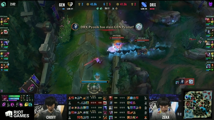 사이드 운영 활로를 뚫은 GEN은 전령 취득을 통해 미드 1차 포탑을 파괴하여 오브젝트 시야 주도권을 얻어냈고 이후 GEN은 킬교환이 발생하지 않는 상황 속에서 최적의 행동을 통해 글로벌 골드를 1.5만에 가깝게 벌려나가는 정교한 운영을 펼쳤다. 결국 DRX는 터널 시야를 뚫고 메인 딜러인 룰러를 처치하며 한타에서 활로룰 모색하려는 강수를 뒀지만 리헨즈(손시우)의 탐 켄치가 집어삼키기를 통해 이를 무위로 돌려버리며 한타를 대승, GEN의 승리에 쐐기를 박는다.