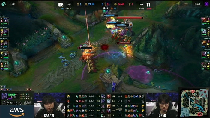 10월 30일(일)에는 A브라켓에서 LPL 1시드 징동 게이밍(JDG)와 LCK 2시드인 T1이 맞붙었다. 양 팀 모두 8강 상대를 3:0으로 손쉽게 압살하면서 절호조의 폼을 자랑했고 강력한 우승 후보들의 격돌인 만큼 기대치가 높았는데 실제로 그에 걸맞는 경기력을 보여주고 있었다.