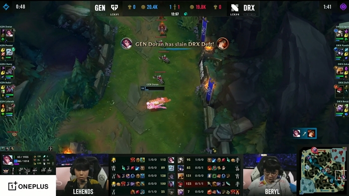 1세트는 GEN이 가져갔다. 베릴(조건희)의 비밀 병기인 하이머딩거를 금지하는 동시에 1티어 바텀 조합을 양 팀 모두 밴카드로 틀어막으며 캐리력보다는 라인전에 집중하는 쪽으로 방향을 잡았고 백중세의 대치 구도가 만들어진다.