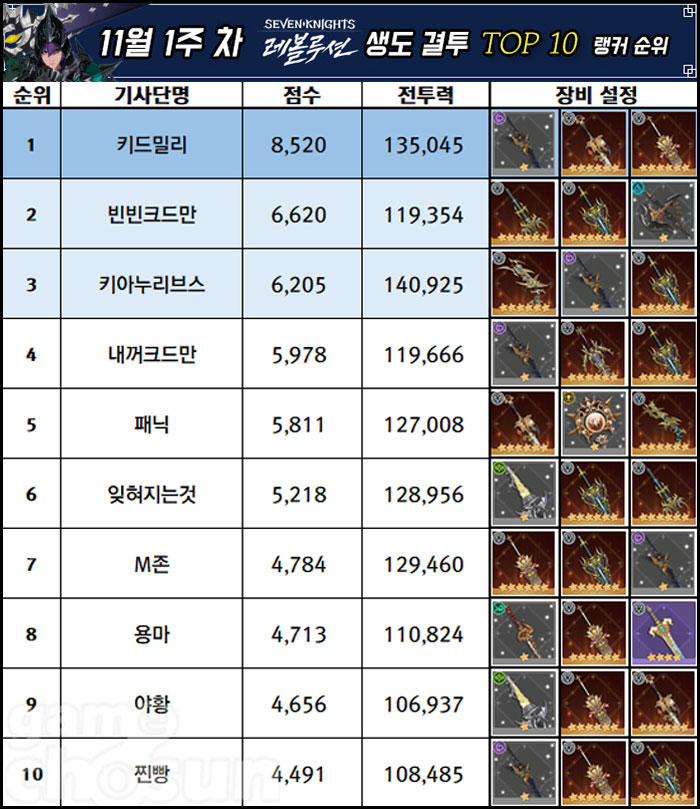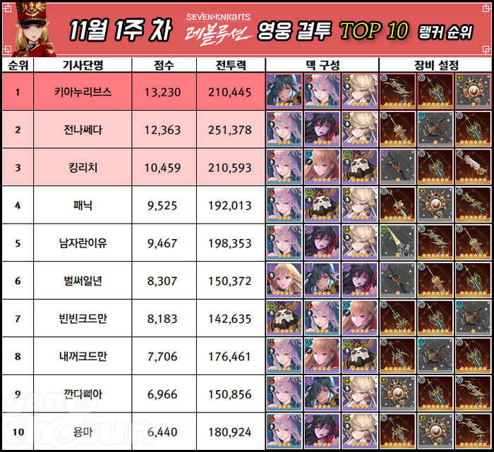 키아누리브스 유저가 다시 한 번 영웅 결투 1위를 차지한 가운데, 전나쎄다와 킹리치 유저와의 삼파전 양상이 이어지고 있는 모양새다. 키아누리브스는 10월 4주차 전나쎄다 유저와 점수 차가 크지 않았으나, 다시 격차를 벌리면서 최정상 자리를 굳건히 하고 있다.