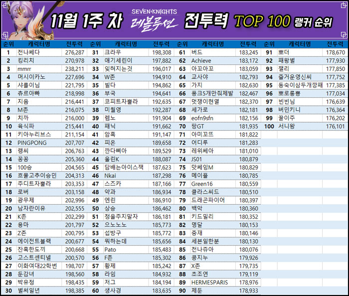 11월 1주차의 전투력 TOP 100 랭커 평균 전투력은 192,527로 나타났으며, 이는 지난주에 비해 평균 전투력 4,621이 상승한 수치다.