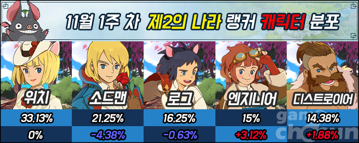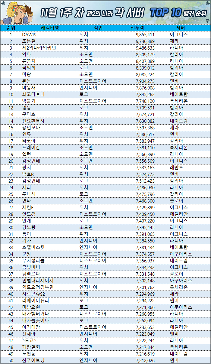 이번 랭킹 각 직업 1위는 다음과 같다. 위치는 이그니스 서버 DAWIS가 1위, 소드맨은 칼리아 서버 '악마'가 4위, 로그는 칼리아 서버 '짝찌끼'가 6위, 디스트로이어는 엔비 서버 '된놈'이 8위 엔지니어는 칼리아 서버 '먀옹새'가 9위다.