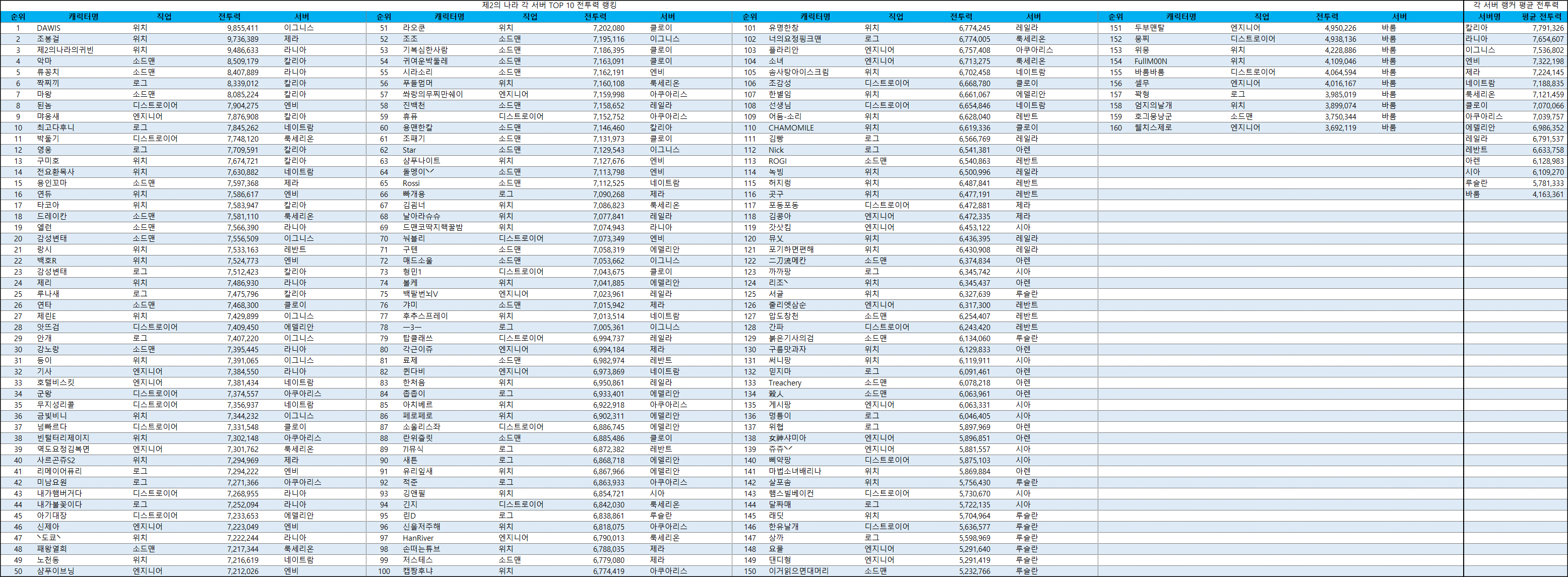 평균 전투력 1위 서버는 변함없이 칼리아 서버. 2위부터 4위까지도 지난주와 동일한 라니아 서버, 이그니스 서버, 엔비 서버 순서대로 갔지만, 5위는 룩세리온 서버를 추월한 제라 서버가 가져갔다.