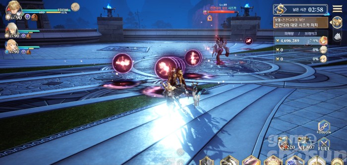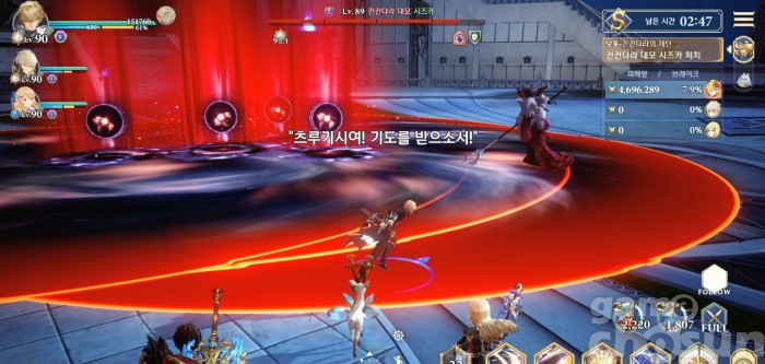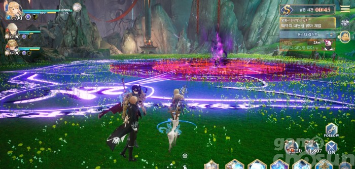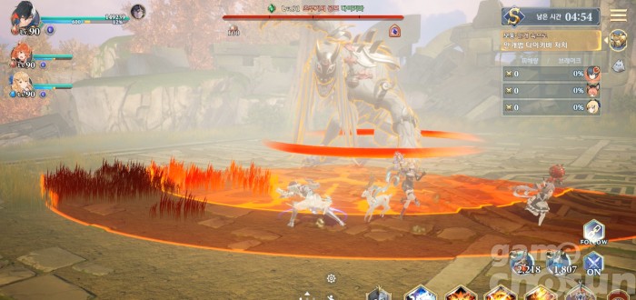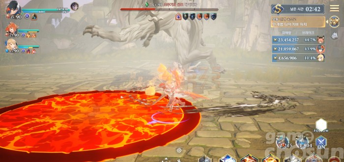 다시 전방 범위 찍기 2번 후 뛰어올라 맵 전체 공격, 처음 범위는 캐릭터를 따라다님