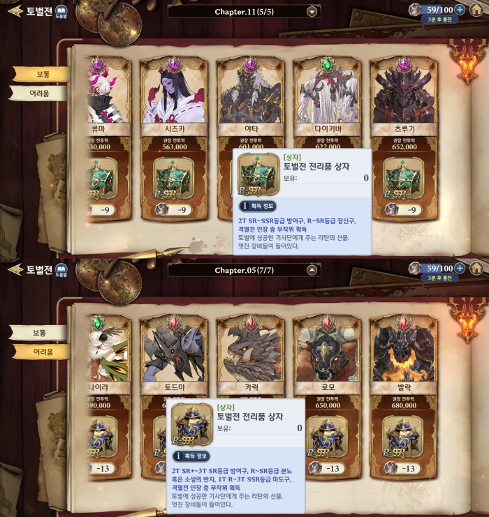 이번 업데이트로 추가된 챕터 11 토벌전 보통 난이도는 기존 메인 스토리 보스 몬스터를 한층 강화시킨 버전이다. 패턴은 그대로지만, 능력치는 상승해 권장 전투력도 5만 가량 상승했다. 획득 가능한 보상은 2T SR~SSR등급 방어구, R~SR등급 장신구, 격멸전 인장으로 모든 보스가 동일하다.