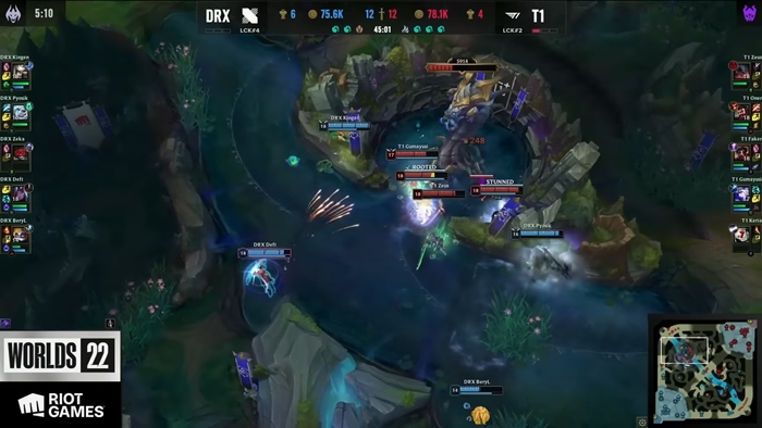 사정거리 문제로 인해 이따금 포킹은 가능해도 팔 자체가 짧아 교전 선택권이 부족했던 DRX는 T1의 조합에 시종일관 휘둘리는 모양새였고 초반 라인전 구도는 물론 후반 팀파이트 밸류에서도 레나타 글라스크의 악수와 적대적 인수를 기반으로 T1이 우위를 놓지 않아 거의 퍼펙트 게임에 가까운 승리를 거뒀다.