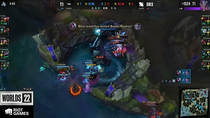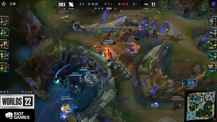 오른의 특성상 팀 전체의 후반 성장치의 고점이 높은 것은 물론 초장거리 이니시에이팅이 가능한 DRX가 게임을 유리하게 가져가는 듯 했으나, T1이 중요한 타이밍마다 절묘한 인원분배와 특작조 파견으로 오브젝트 점수를 잘 쌓아놓은 게 든든한 보험으로 남아 있었고, DRX의 기습 바론 사냥을 오너(문현준)과 구마유시(이민형)가 연달아 스틸하면서 T1이 대역전, 넘어갈 뻔했던 경기를 순식간에 뒤집어 버린다.
