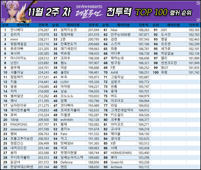 전투력 TOP 100 평균 전투력은 197,808이며, 지난주 대비 5,281이 상승했다.