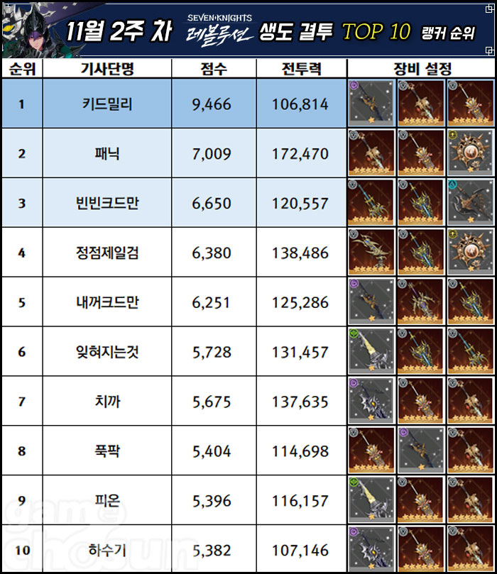 11월 2주차의 생도 결투에서는 태오 검과 연희 보주, 세인 도끼, 제이브 랜스, 크리스 대검 등 랭커들이 다양한 영웅 무기를 활용하는 것을 확인할 수 있었으며, 영웅 결투에서는 완성형 덱 3종이 최상위권을 차지하는 경향을 나타냈다.