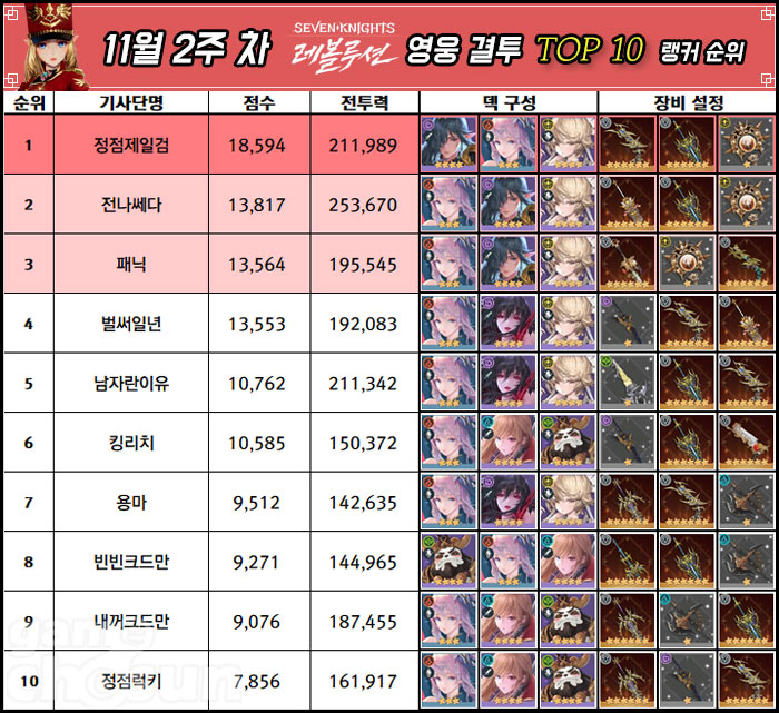 정점제일검이 4주 연속으로 1위를 기록하면서 영웅 결투 최강자임을 다시 한 번 증명했다. 특히 2위인 전나쎄다 유저와 무려 약 5,000점 차이의 점수를 벌리면서 압도적인 기량을 뽐내고 있다. 2, 3위권은 매우 경쟁이 치열한 상태다. 전나쎄다 유저와 패닉, 벌써일년 유저는 매우 근소한 점수로 경쟁 중에 있는 상태다.