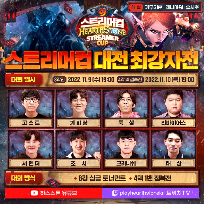 매번 많은 인기를 모아온 스트리머컵 대회가 이번에는 얼어붙은 냉기로 가득 채워진다. 얼어붙은 왕좌의 기사들(Knights of the Frozen Throne) 카드들이 일시적으로 정규전으로 돌아와 메타가 크게 출렁인 가운데, 스트리머컵 – 대전 최강자전이 오늘 11월 9일과 내일 10일 양일 간 저녁 7시부터 하스스톤 공식 유튜브 채널 및 공식 트위치 채널을 통해 방송된다.