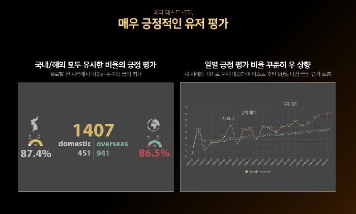 지난 6월 9일부터 26일까지 실시한 스팀 글로벌 베타 테스트에서 얻은 유저 평가와 피드백을 공개했다. 스팀 사용자 평가에서 87%에 달하는 유저들이 게임성을 긍정적으로 평가했으며 이는 국내, 해외 유저 모두 비슷한 수치를 기록했다. 특히, 테스트 기간 중 얻은 피드백으로 세 차례에 걸쳐 패치를 진행하며 긍정 평가 비율이 높아졌다.
