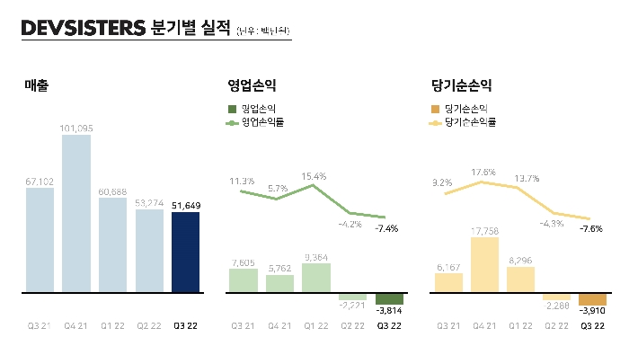 [자료제공 = 데브시스터즈] 데브시스터즈(공동대표 이지훈, 김종흔)가 11일 K-IFRS 연결 기준 2022년 3분기 실적을 발표했다
