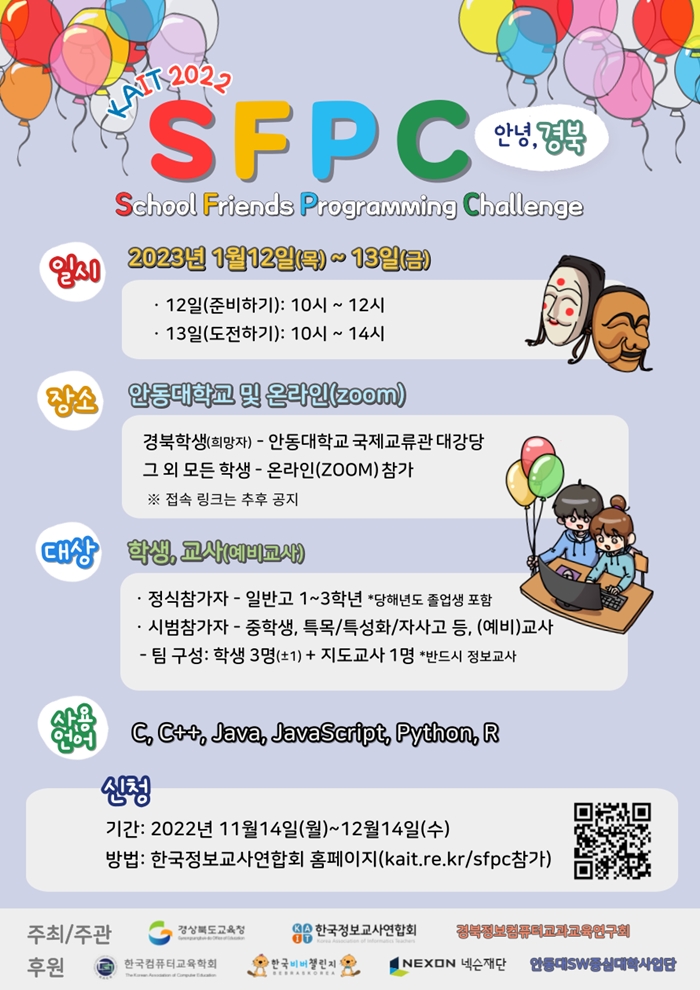 ‘SFPC’는 전국 일반고 학생이라면 누구나 참가할 수 있고, 중학생과 특성화 및 특목고 등의 학생, 교사(예비교원 포함)도 시범 참가자로서 참여할 수 있다. 참가 신청은 오는 12월 14일까지 한국정보교사연합회 공식 홈페이지에서 가능하다. 대회는 참가 학생 3명과 소속학교 교사 1명으로 팀을 구성해 진행되며, 내년 1월 12일부터 13일까지 양일간 안동대학교 및 줌(ZOOM)을 통해 온·오프라인 병행 개최된다.