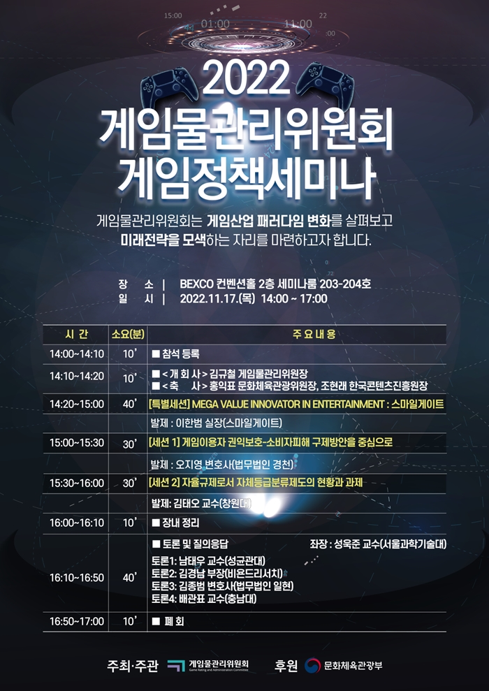 [자료제공 = 게임물관리위원회] 게임물관리위원회(이하 ‘게임위’, 위원장 김규철)는 17일(목) 오후 2시부터, 부산 해운대 BEXCO에서 게임위 주최/주관, 문화체육관광부 후원으로 ‘2022 게임정책세미나’를 개최한다.