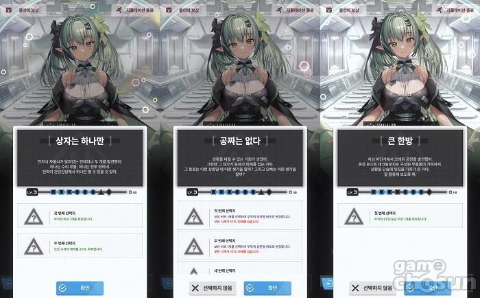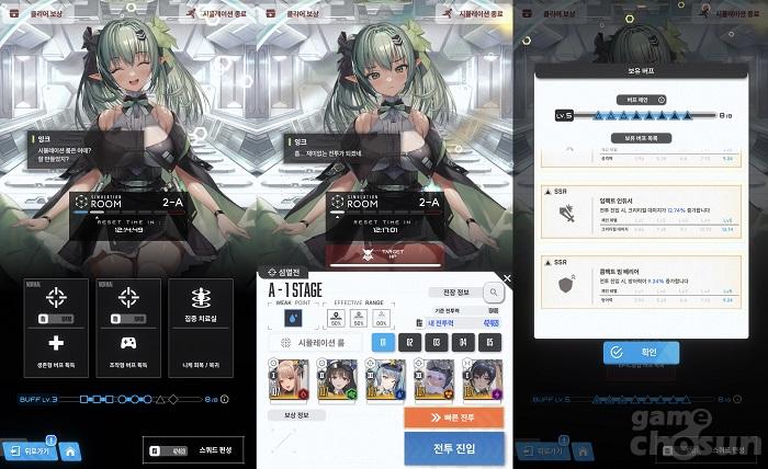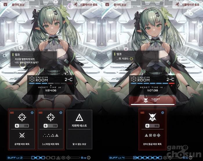 시뮬레이션 룸 진행은 간단하다. A섹터에 진입해 각 스테이지는 전투와 지휘력 테스트, 집중 치료실 등의 이벤트로 구성돼 있으며, 전투 이벤트를 클리어할 시에는 다양한 버프 보상 선택지가 주어진다. 특히 전투 이벤트에 참여하기 전에 버프의 종류를 체크할 수 있으므로 어떤 버프 효과를 획득할 것인지 신중히 골라야 한다.