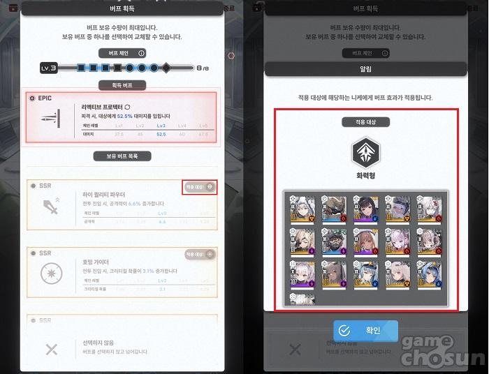이때는 버프 타입도 중요하지만 버프 등급과 버프 적용 대상 니케를 우선적으로 고려해야하며, 보스 전투 스테이지 이전의 슈퍼 체인지 찬스 이벤트를 활용해 최종적으로 버프 5레벨의 체인 효과를 발동시키는 것을 추천한다.