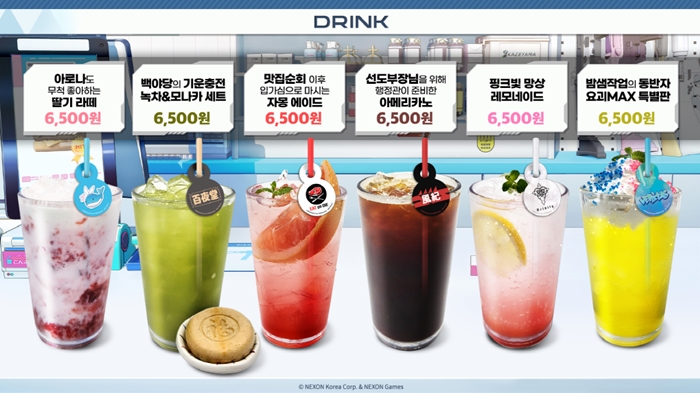 카페 내부는 ‘아비도스 고등학교’, ‘트리니티 종합학원’ 등 다양한 ‘블루 아카이브’ 학원 일러스트는 물론, ‘아로나’, ‘시로코’, ‘유우카’ 등 게임 속 학생들로 꾸며져, 이용자들이 마치 ‘키보토스’에 방문한 것 같은 느낌을 제공한다.