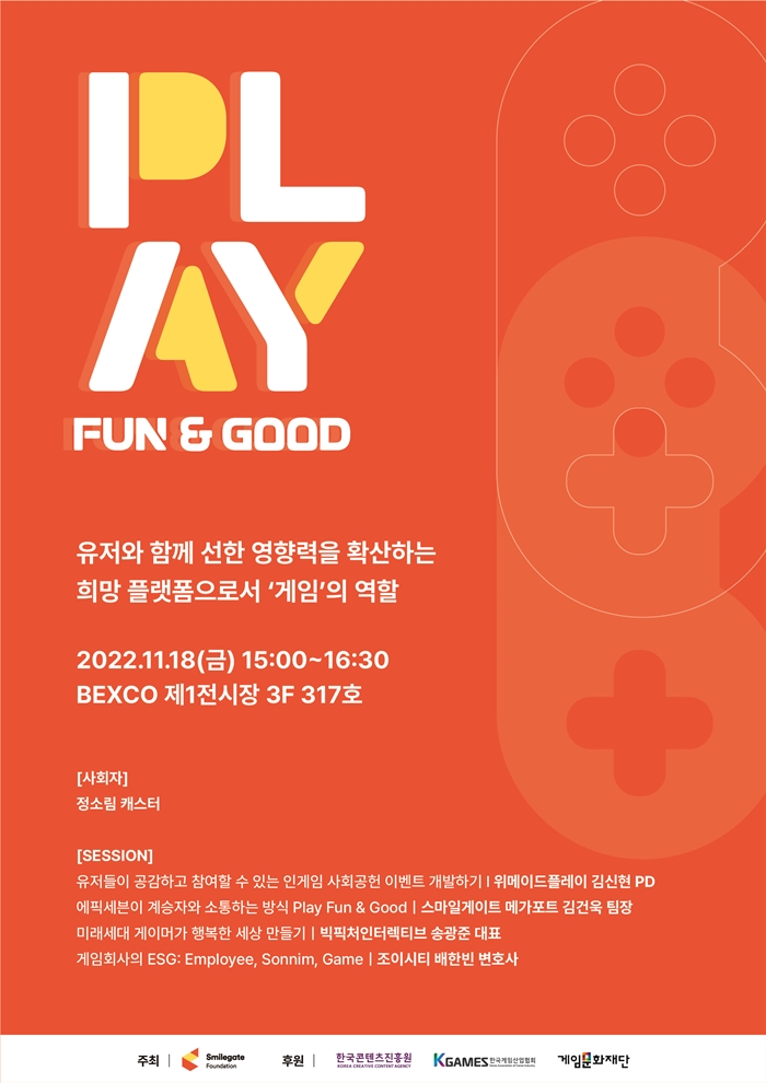 [자료제공 = 스마일게이트] 스마일게이트 희망스튜디오가 주최하고, 한국콘텐츠진흥원과 한국게임산업협회, 게임문화재단이 후원하는 ‘플레이펀&굿(Play Fun&Good)’ 포럼이 지스타(G-Star) 기간에 열린다. 포럼은 11월 18일 (금) 오후 3시에 부산 벡스코 제 1전시장 317호에서 진행될 예정이다.