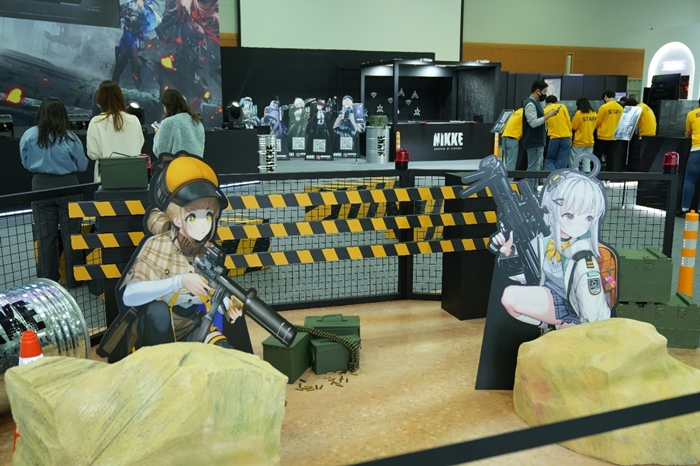 부스에는 ‘승리의 여신: 니케’ 인게임 분위기를 보여주는 포토존이 마련됐다. 게임 속 전투가 펼쳐지는 스테이지의 지형과 탄피, 바위 지형물, 엄폐물 등 오브젝트 연출로 사실감 있게 묘사했다.