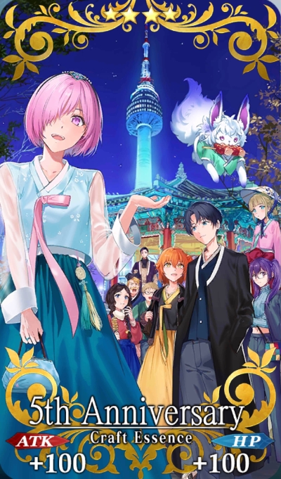 이번 특별 개념예장은 <페이트/그랜드 오더> 서번트와 등장인물들이 한복을 입고 남산타워 앞에서 포즈를 취하는 일러스트로, '5주년 기념 특별 횟수 로그인 보너스' 1일차에 받을 수 있다.