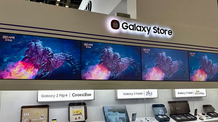 삼성전자는 '갤럭시 스토어' 부스에서 최신 모바일 기기를 통해 '검은사막 모바일'을 즐길 수 있게 했다. 전시된 최신 게이밍 모니터에서는 고퀄리티 '검은사막 모바일' 플레이 영상을 상영하고 있다.